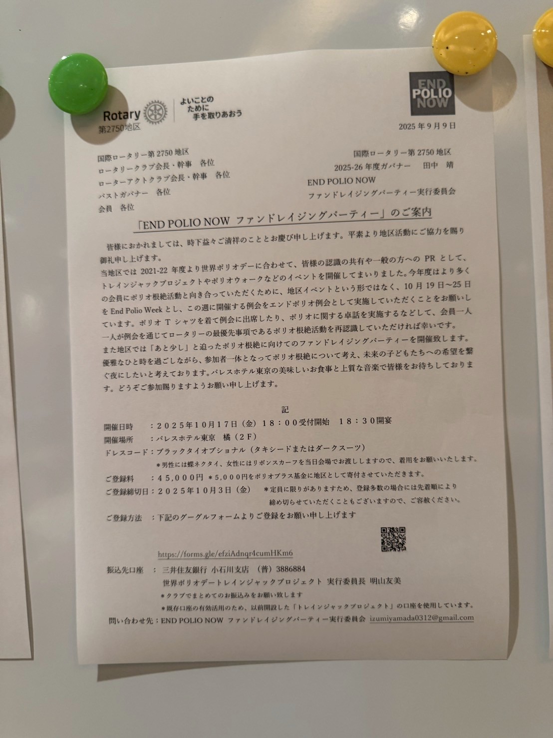 本年度もポリオ根絶支援企業寄付(一口5万円)をお願い申し上げます。あわせて、私がコーディネーターを務めておりますポリオプラス・ソサエティ(年間100ドル寄付制度、うち30ドルはクラブ負担、残り70ドルをご負担)への参加も受け付けております。いずれもご協力いただける方は私までご連絡ください。
