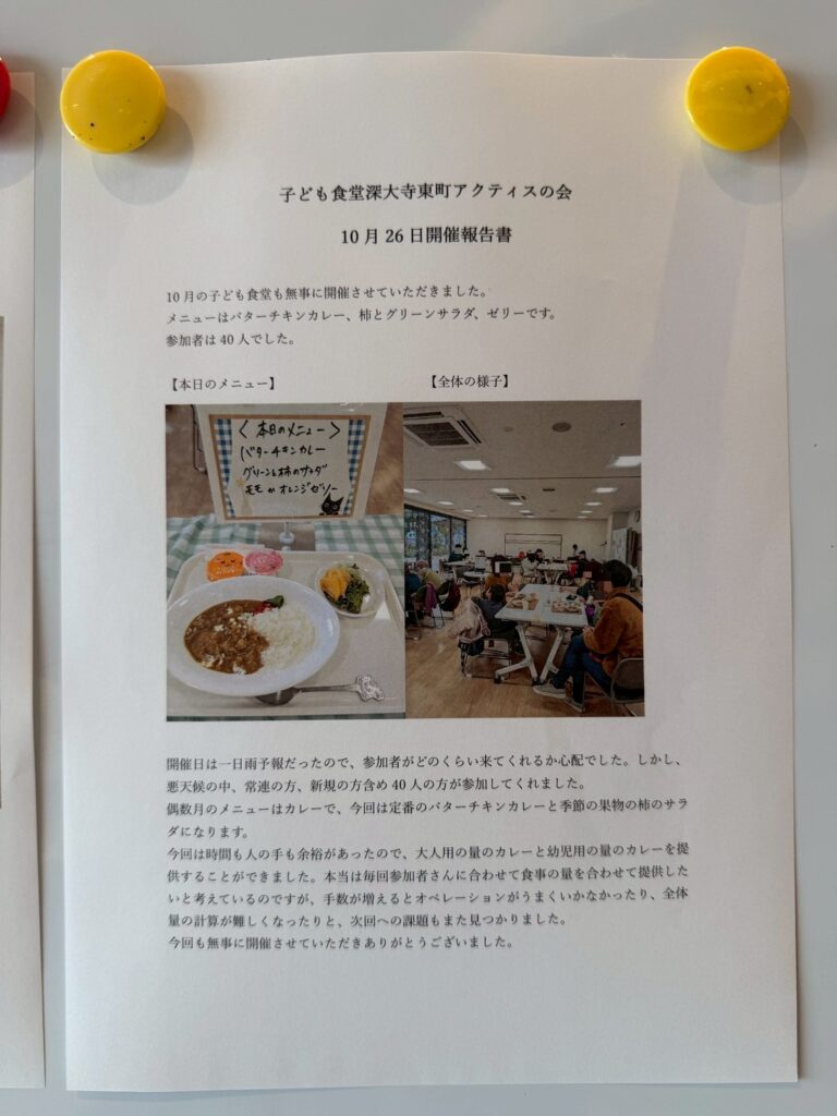 ・子ども食堂深大寺東町アクティスの会から報告書が届いております。掲示してありますのでご覧ください。