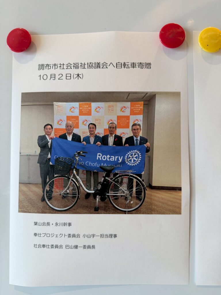 ・10月2日に会長・幹事・小山宇一担当理事、巴山社会奉仕委員長の4名で電動自転車1台を社会福祉協議会に寄付してきました。