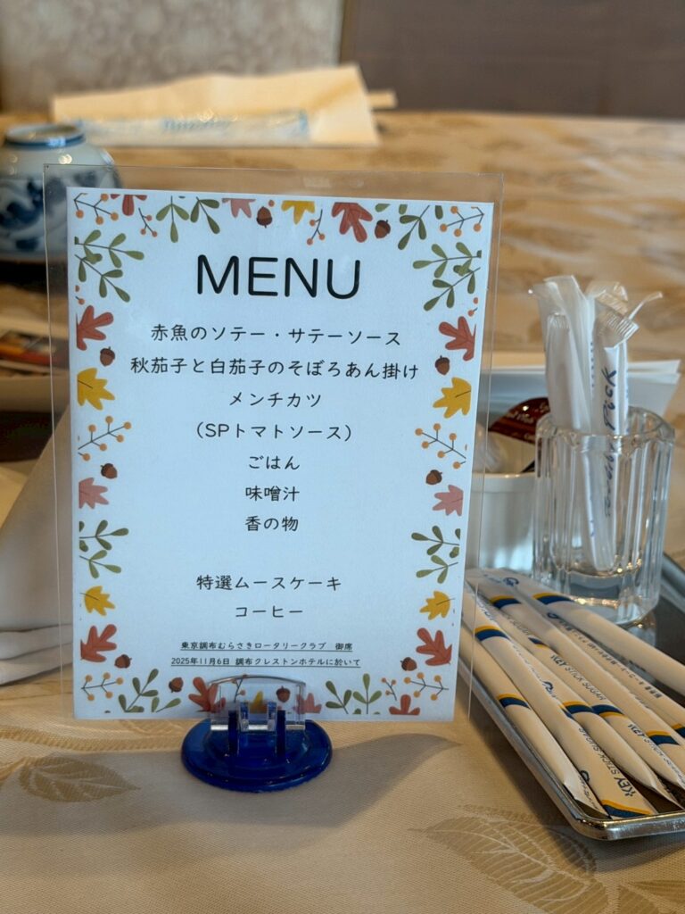 ・10/23に開催されました創立35周年記念例会にて席次表・メニューをお持ち帰りにならなかった方の分をホテルよりお預かりしております。お受け取りを希望の方は事務局までお申し出ください。