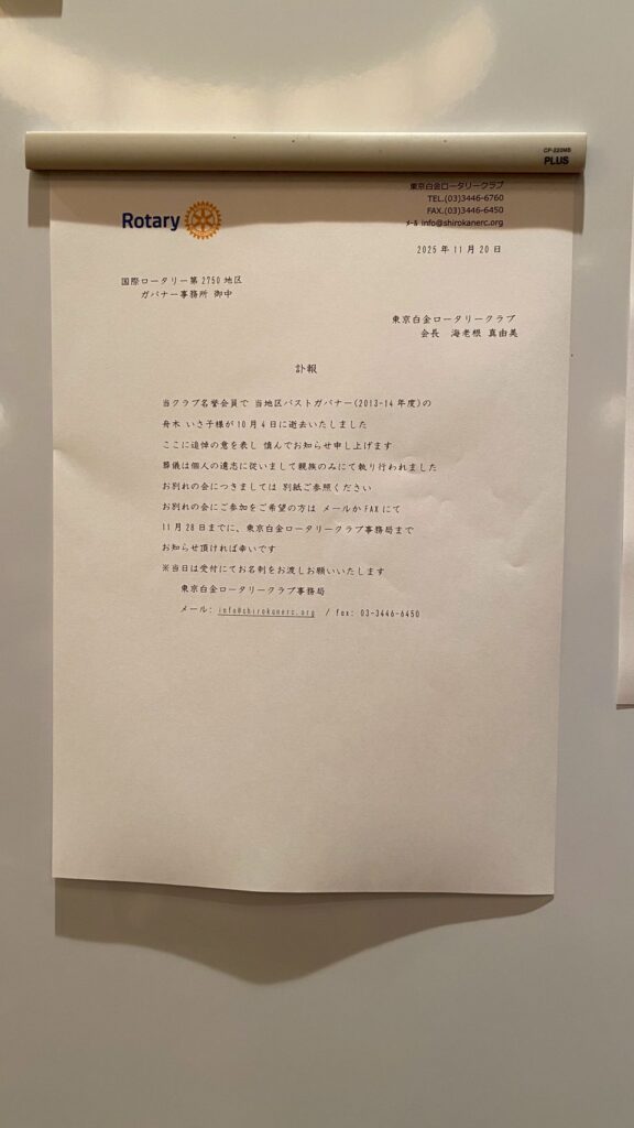 ・11月27日(木)は休会となります。次回例会は12月4日(木)昼例会となります。この日はクラブ協議会を開催いたしますので、少し早めの登録開始となります。