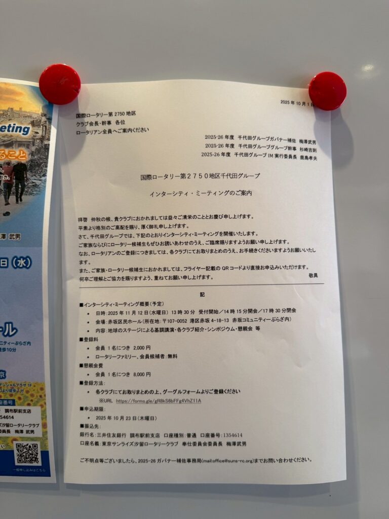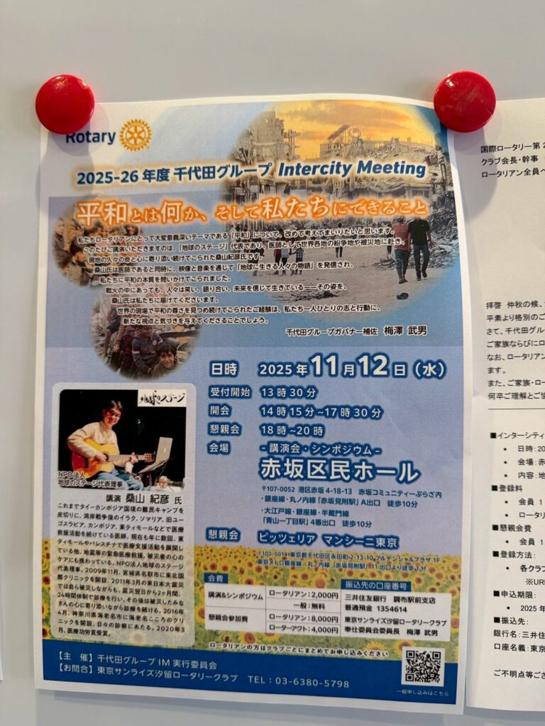 ・千代田グループよりインターシティ・ミーティングのご案内が届いております。詳細は掲示してありますのでご覧ください。参加希望の方は事務局までご連絡ください。