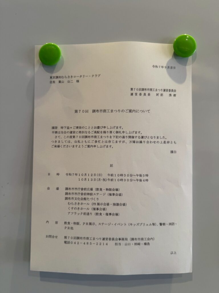 ・10月12日、13日に「第70回 調布市商工まつり」が開催されます。今回は阿部秀樹会員が運営委員長を務めております。私も土屋寿美代会員と一緒にお手伝いさせていただいております。お時間のあります方は、ぜひご参加いただければ嬉しいです。