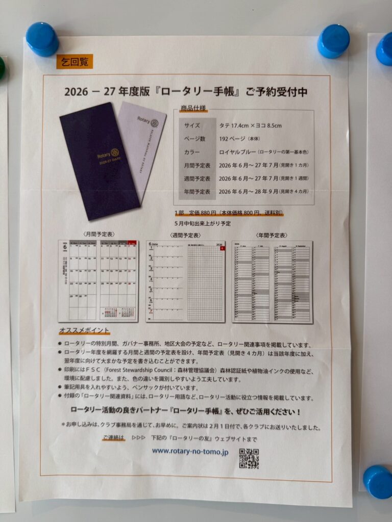 ・ロータリー手帳の予約のご案内が届いております。購入希望の方は事務局までお願いします。