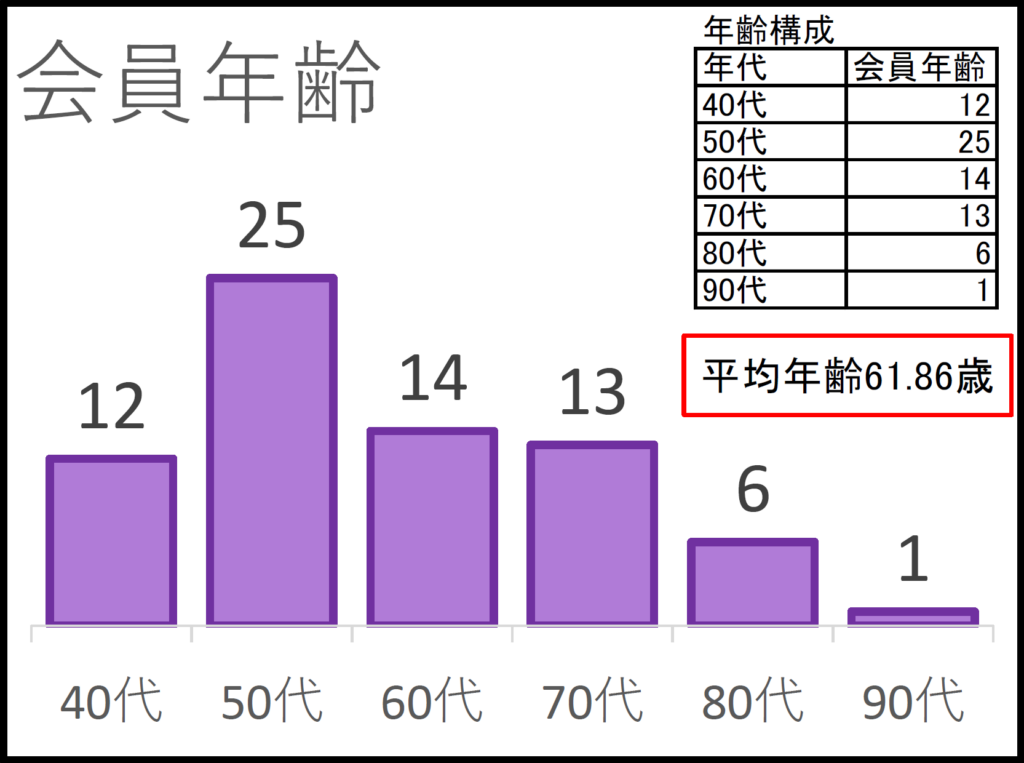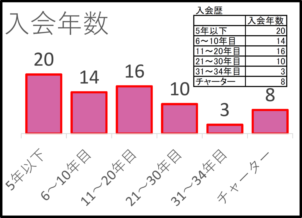 当クラブの平均年齢は61.86歳。50代を中心に、40代から90代まで幅広い世代が活動中です。 ロータリー歴で見ると、入会5年以下の新しい仲間が20名と最多を占める一方で、8名のチャーターメンバーが重厚な歴史を支えています。「むらさき」の名の通り、新旧の個性が鮮やかに混ざり合う、非常にバランスの取れた組織であることが再確認できました。